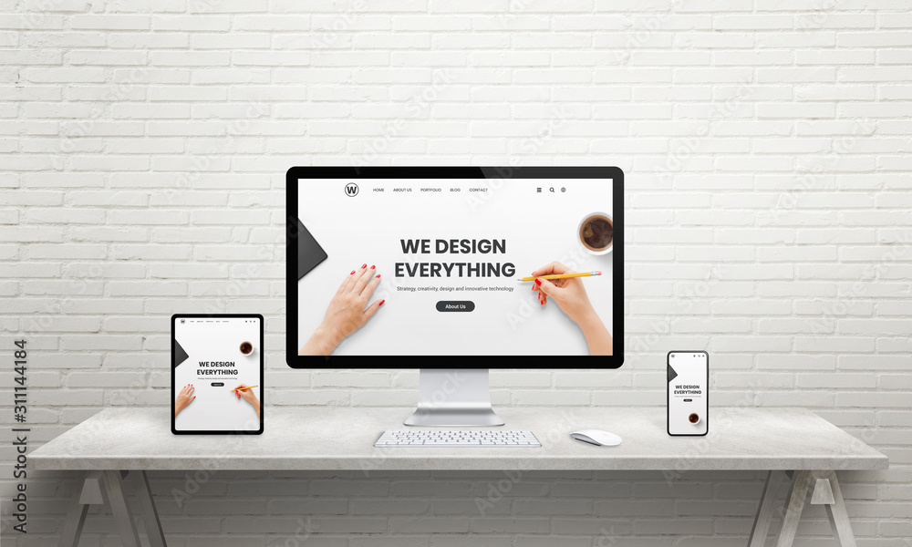 The watermark will not be included on Canvas Print.: Designer desk with computer display, tablet and phone - designer studio page on device displays - reso