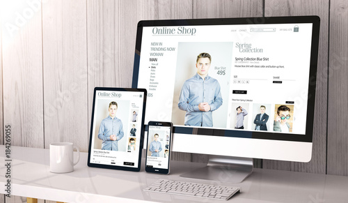 The watermark will not be included on Canvas Print.: Devices responsive on workspace showing responsive online shop