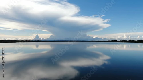 The watermark will not be included on Canvas Print.: Dramatic clouds move gracefully across the sky, reflecting their dynamic patterns on a still body of