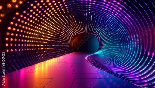 The watermark will not be included on Canvas Print.: Dynamic vibrant light tunnel illusion with flowing lines of color and reflective surfaces in motion