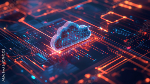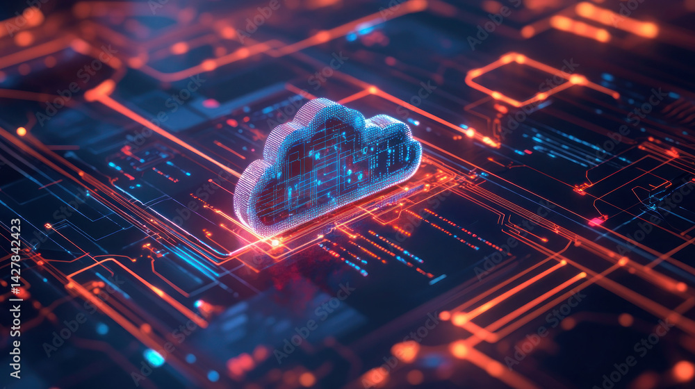 The watermark will not be included on Canvas Print.: Electronic circuit board with processor design, a digital tech concept with cloud symbols