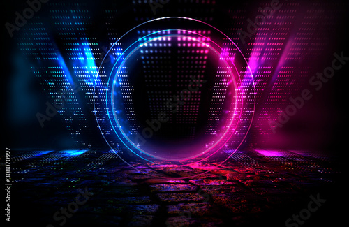 Canvas Prints empty background scene. dark street reflection on wet asphalt. rays of neon light in the dark, neon