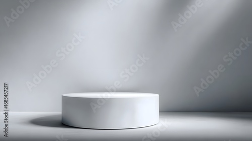 The watermark will not be included on Canvas Print.: Empty white cylindrical podium with soft light and subtle shadows against a minimalist gray backgrou