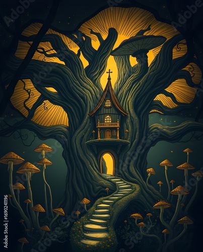 Canvas Prints enchanted treehouse at night - a whimsical treehouse nestled within a giant, gnarled tree glows warm - Canvas Prints Canvas Prints enchanted treehouse at night - a whimsical treehouse nestled within a giant, gnarled tree glows warm - Canvas Prints