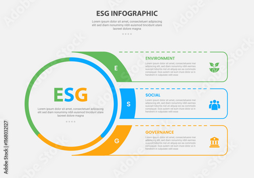 The watermark will not be included on Canvas Print.: Esg infographic outline style with 3 point template with big circle and fluid rectangle box containe
