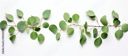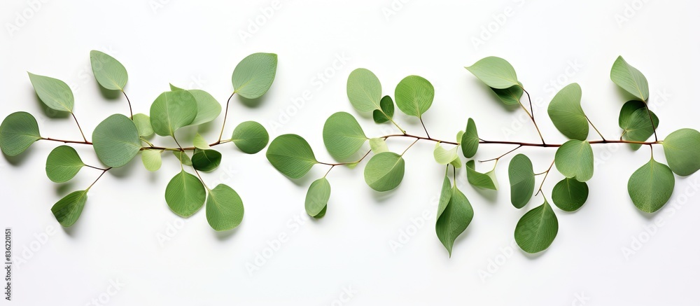 The watermark will not be included on Canvas Print.: Eucalyptus and populus branch wreath frame on white background with a flat lay view, offering a spac