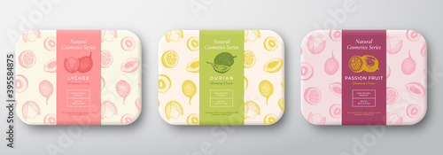 The watermark will not be included on Canvas Print.: Exotic fruits bath cosmetics package set - abstract vector wrapped container labels - packaging design