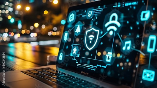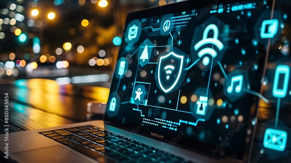 The watermark will not be included on Canvas Print.: Expansive banner display featuring a laptop showcasing multiple icons