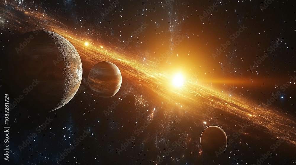 Canvas Prints exploring the vastness of space with planets orbiting a glowing sun in a colorful cosmic landscape.  - Canvas Prints Canvas Prints exploring the vastness of space with planets orbiting a glowing sun in a colorful cosmic landscape. - Canvas Prints