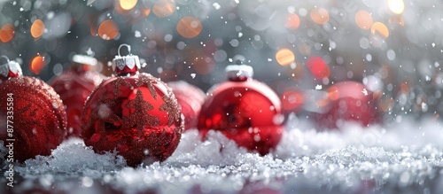 The watermark will not be included on Canvas Print.: Festive christmas ornaments in snow with a shiny grey background ideal for a copy space image