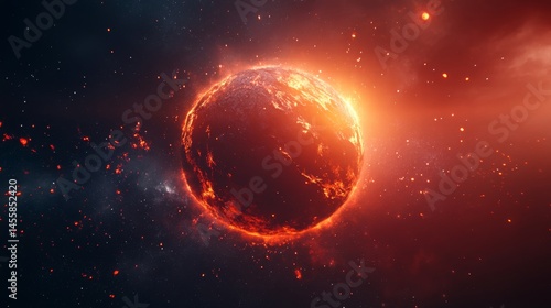 The watermark will not be included on Canvas Print.: Fiery planet with bright orange glow and glowing particles in space