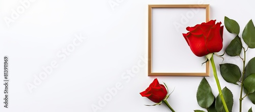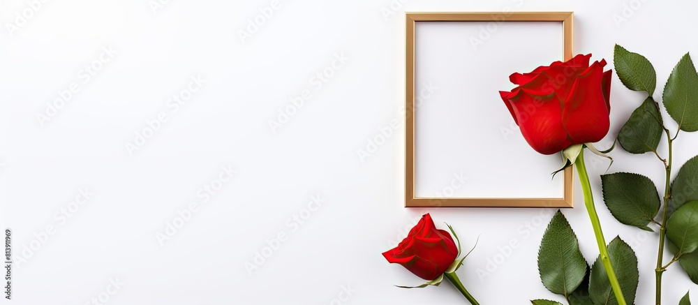 Canvas Prints flat lay view of a red rose and photo frame on a white background offering ample copy space for cust