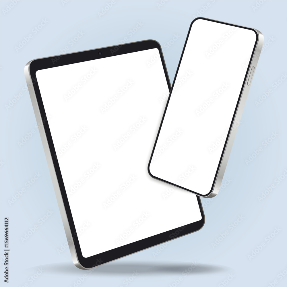 The watermark will not be included on Canvas Print.: Floating smartphone and tablet mockup with blank screens on a blue background