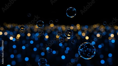 The watermark will not be included on Canvas Print.: Floating soap bubbles with blue and gold bokeh lights on black background abstract