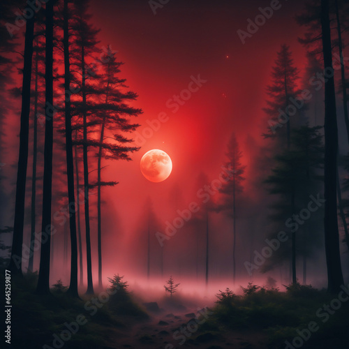 The watermark will not be included on Canvas Print.: Forest fog scenery with big red moon