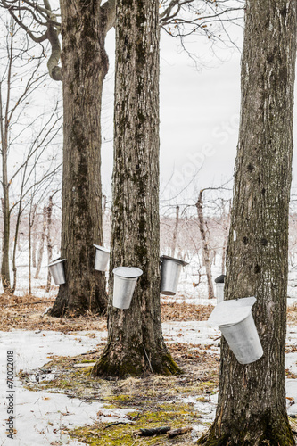 Canvas Prints forest of maple sap buckets on trees