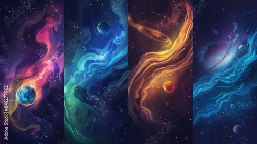 The watermark will not be included on Canvas Print.: Four different space scenes with planets and stars