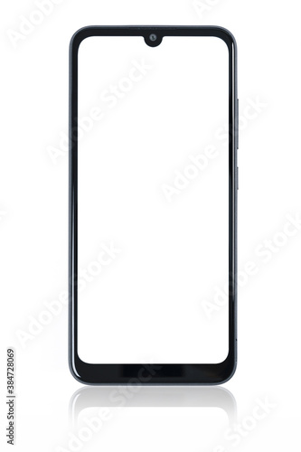 The watermark will not be included on Canvas Print.: Front view of a new modern black smartphone mockup with blank white screen and mirror reflection iso