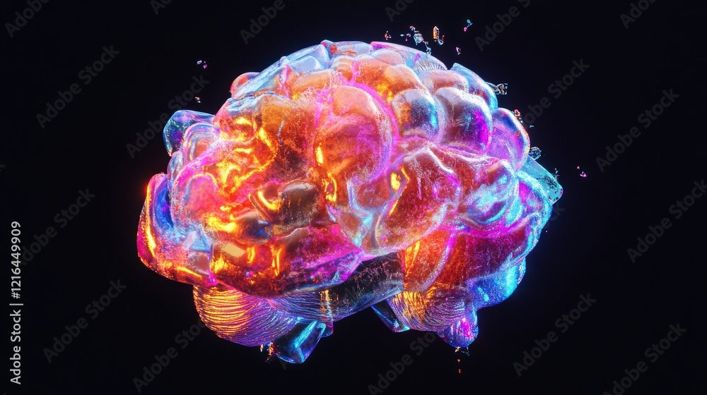 The watermark will not be included on Canvas Print.: Futuristic 3d render of a neon-colored brain with glowing neural connections on a dark black backgro