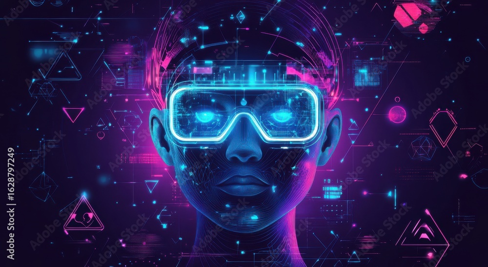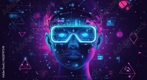 The watermark will not be included on Canvas Print.: Futuristic ai robot head with neon cyber glasses against a digital background representing advanced