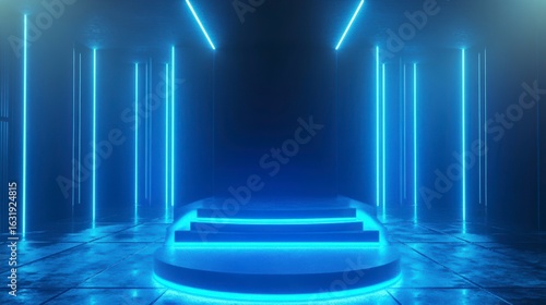 The watermark will not be included on Canvas Print.: Futuristic blue neon light illuminating empty stage with steps -