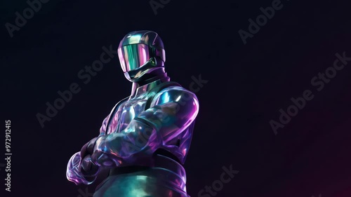 The watermark will not be included on Canvas Print.: Futuristic character in neon armor on a dark background