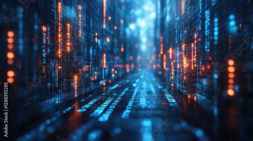 The watermark will not be included on Canvas Print.: Futuristic digital corridor illuminated by glowing blue and orange data streams in a tech landscape