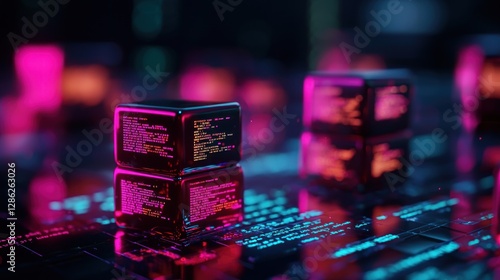 The watermark will not be included on Canvas Print.: Futuristic digital cubes with neon glow on a circuit board, symbolizing advanced technology