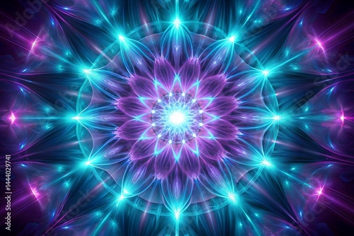 The watermark will not be included on Canvas Print.: Futuristic mandala pattern with violet and turquoise glow