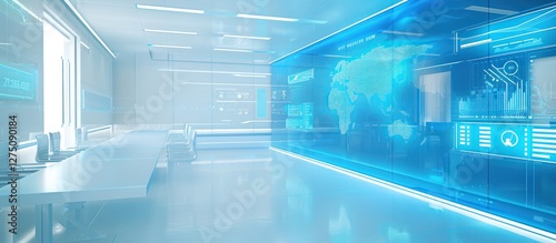 The watermark will not be included on Canvas Print.: Futuristic office interior with interactive wall displays showing global data and charts -