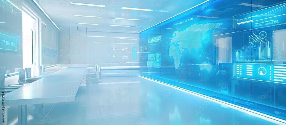Canvas Print : Futuristic office interior with interactive wall displays showing global data and charts -
