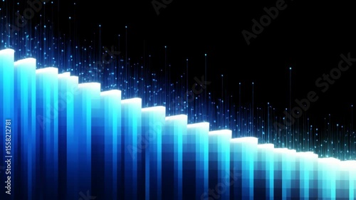 The watermark will not be included on Canvas Print.: Futuristic video concept with a low-angle view of glowing blue pixelated columns rising against a da