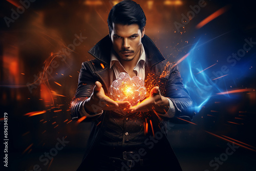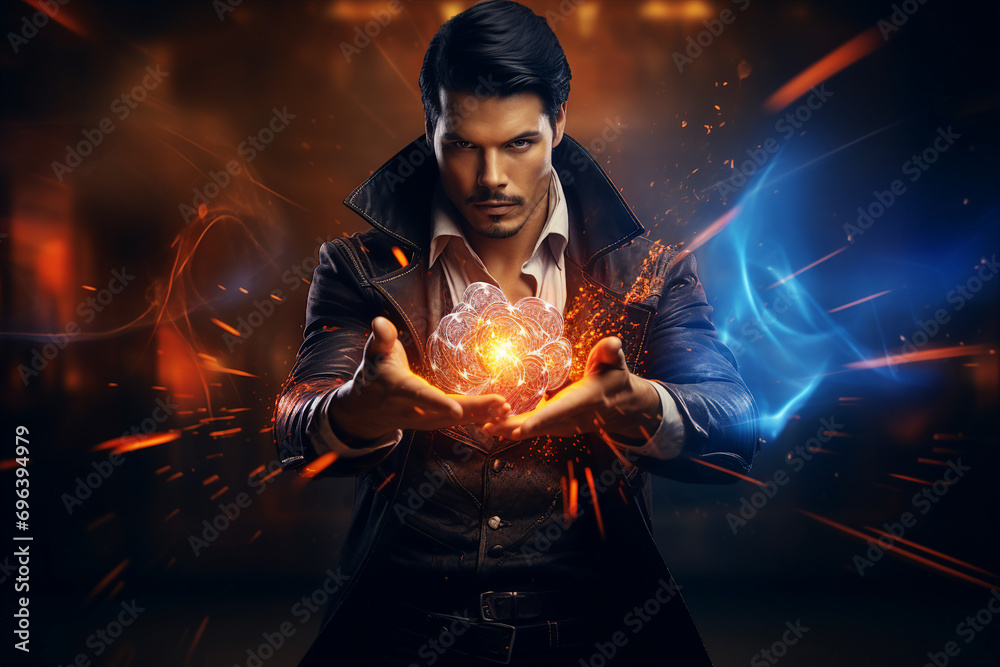 The watermark will not be included on Canvas Print.: Generative ai image picture of powerful elements wizard practicing ice water air fire magic video ga