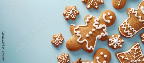 The watermark will not be included on Canvas Print.: Gingerbread christmas cookies displayed on a pastel blue backdrop with copy space image