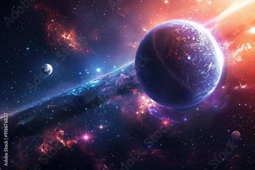 The watermark will not be included on Canvas Print.: Glowing blue and purple planet with a moon in the vastness of space -