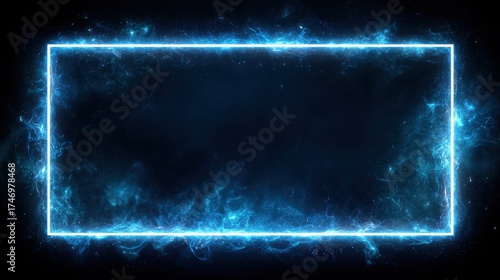 The watermark will not be included on Canvas Print.: Glowing blue neon rectangular frame on dark background