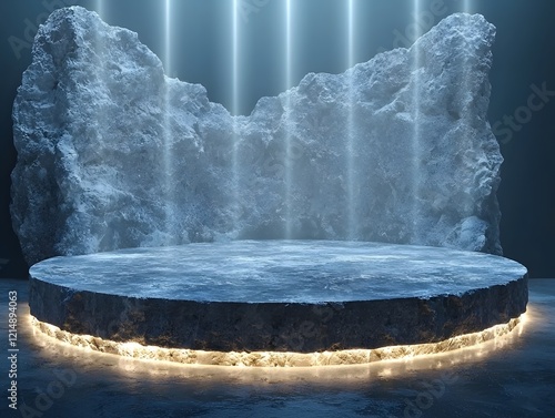The watermark will not be included on Canvas Print.: Glowing crystal like podium illuminated by beams of light in misty dark room for product display con