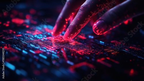 The watermark will not be included on Canvas Print.: Glowing fingers interacting with a digital interface, abstract technology background