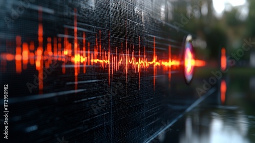 The watermark will not be included on Canvas Print.: Glowing orange waveform on dark tech background -