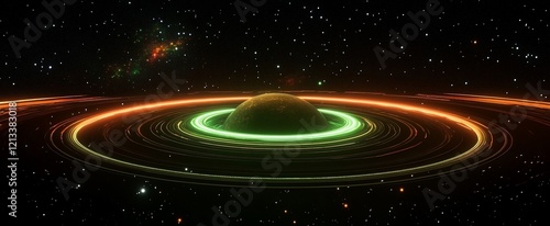 The watermark will not be included on Canvas Print.: Glowing planet with vibrant rings in space -