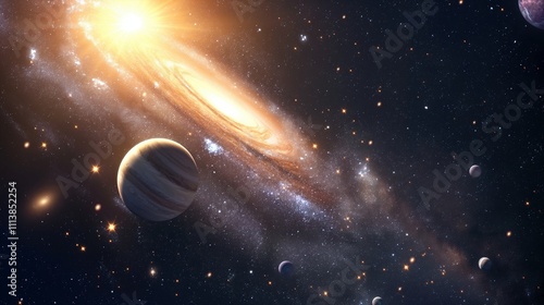 The watermark will not be included on Canvas Print.: Glowing round galaxy and gas giant in dark space image - glaring cosmic formation in universe photogr