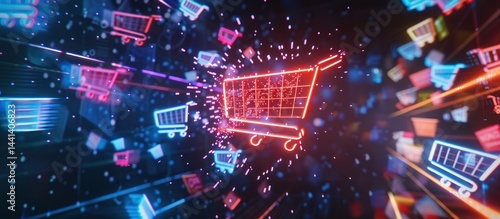 The watermark will not be included on Canvas Print.: Glowing shopping cart icon surrounded by fast-moving carts -