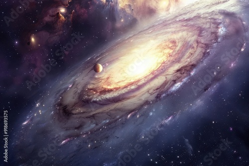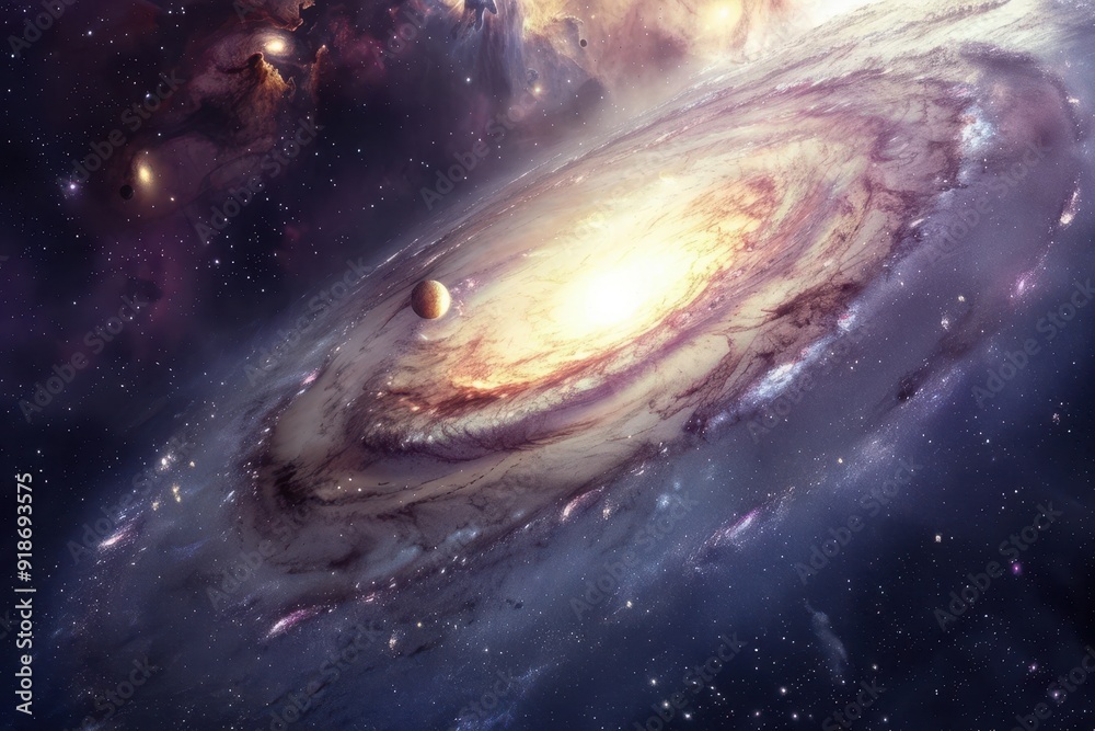 Canvas Print : Glowing spiral galaxy with a bright center and a planet orbiting it, surrounded by colorful nebulae