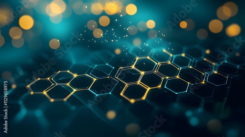 Canvas Prints golden and teal hexagonal patterns illuminated with sparkling light points and a dreamy bokeh backgr
