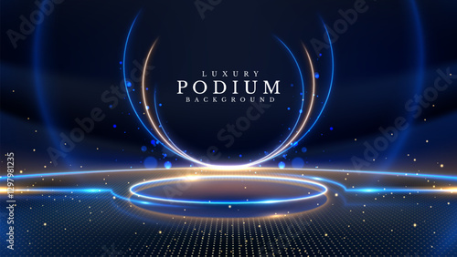 The watermark will not be included on Canvas Print.: Golden glowing product display stand with blue neon light effect and bokeh on dark stage backdrop, e