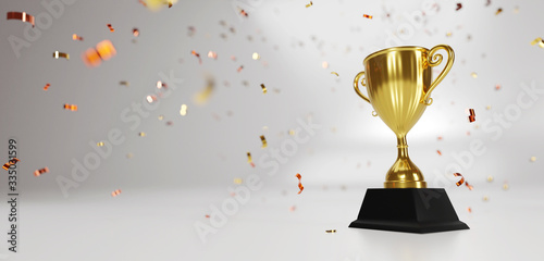 Canvas Prints golden trophy cup with falling confetti with realistic confetti on white background. copy space for