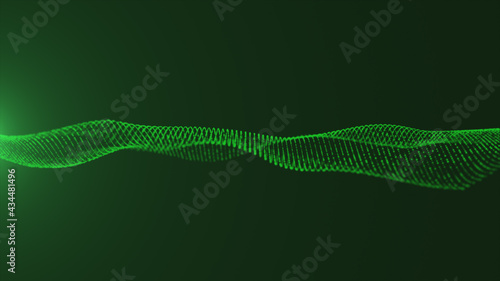 The watermark will not be included on Canvas Print.: Green spinning wave particles technology concept with camera moving