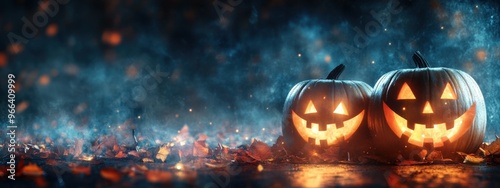 The watermark will not be included on Canvas Print.: Halloween pumpkins illuminated by warm lights on a dark background with copy space for a banner capt