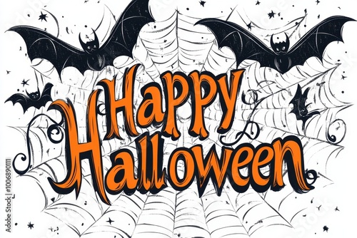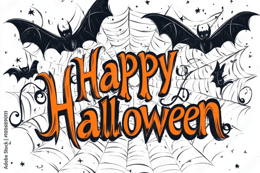 The watermark will not be included on Canvas Print.: Hand-drawn "happy halloween" lettering with spider web and bats on a white background template for a