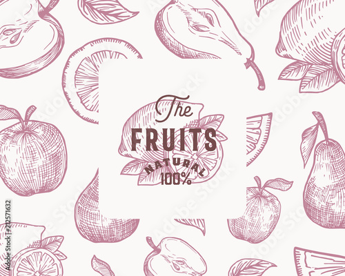 The watermark will not be included on Canvas Print.: Hand drawn oranges, lemon, apple and pear vector background pattern - abstract fruits sketch card or